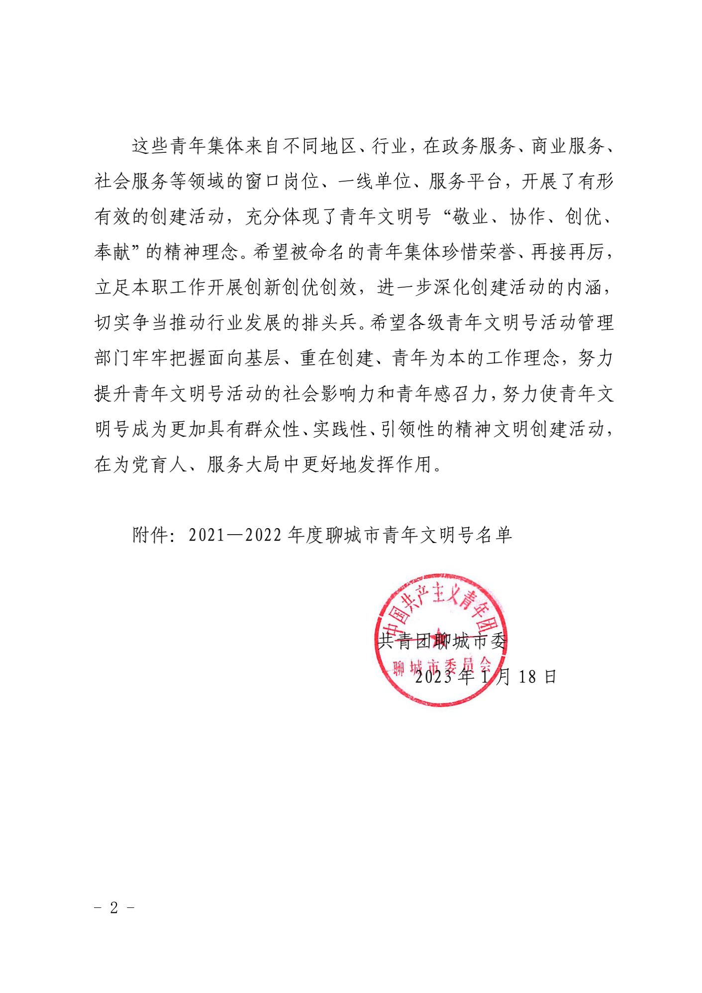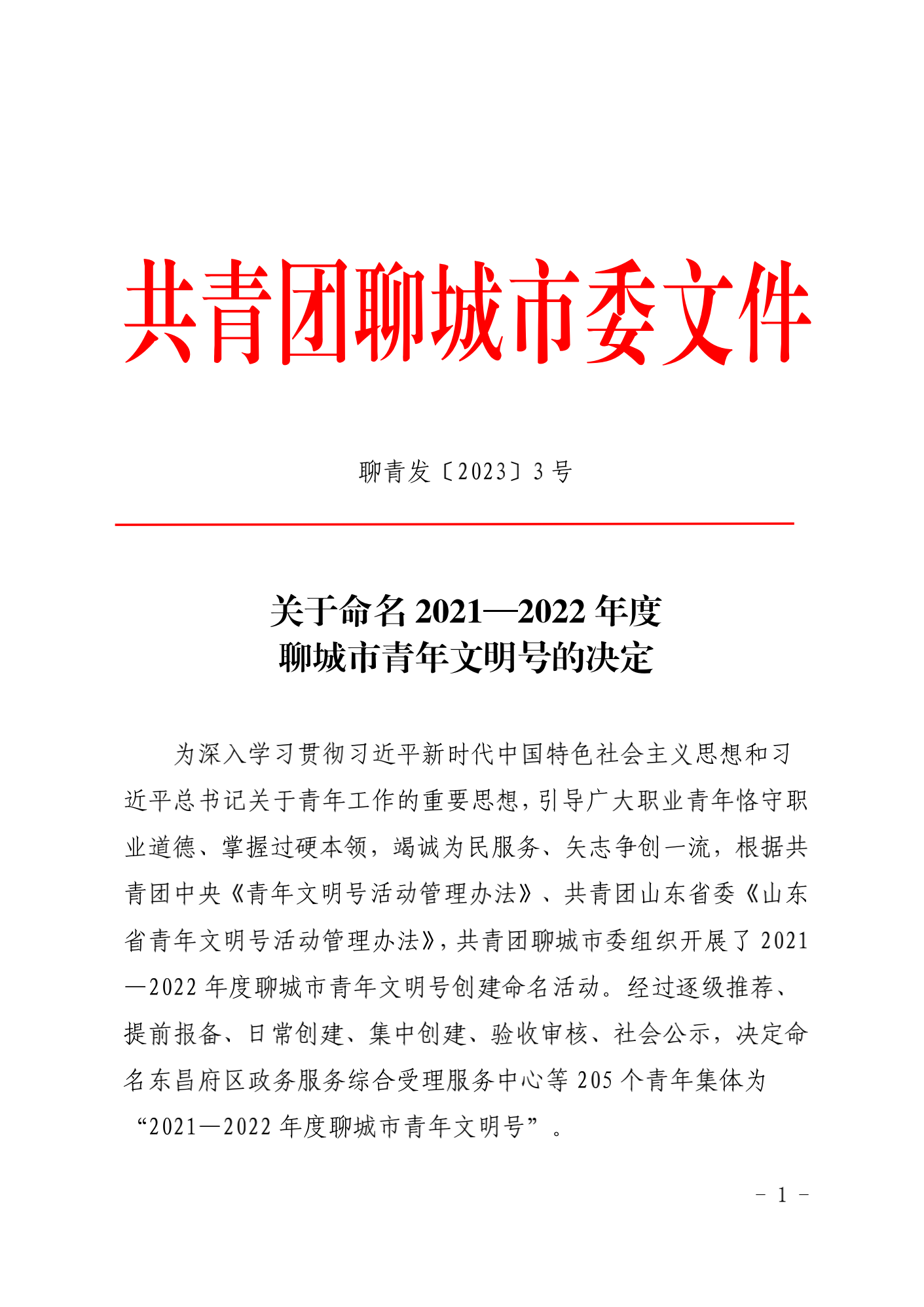 近日,共青團(tuán)市委印發(fā)《關(guān)于命名 2021—2022年度聊城市青年文明號(hào)的決定》(聊青發(fā)〔2023〕3號(hào)),聊城市財(cái)金清潔能源熱力有限公司榮獲“2022年度市級(jí)青年文明號(hào)”榮譽(yù)稱號(hào)。